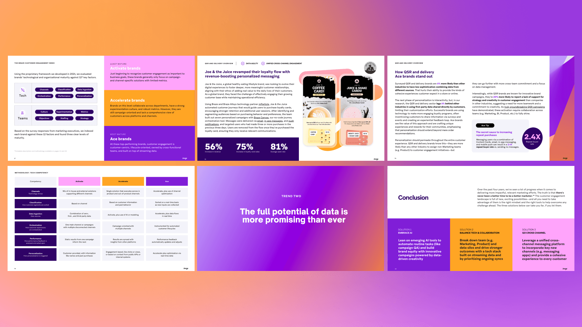 Braze is a customer engagement technology company, and I was working with the in-house creative team on the brand redesign, with a special focus on photography. Additionally, I led the creative in a tentpole project to launch the new rebrand – the Global Customer Engagement Review. This comprehensive report, based on insights from a survey of 1,900 VP-level marketing executives, highlighted emerging trends and offered strategic solutions for customer engagement. My contributions included designing a 48-page animated report, producing a sizzle reel video, and overseeing the development of social and product graphics.